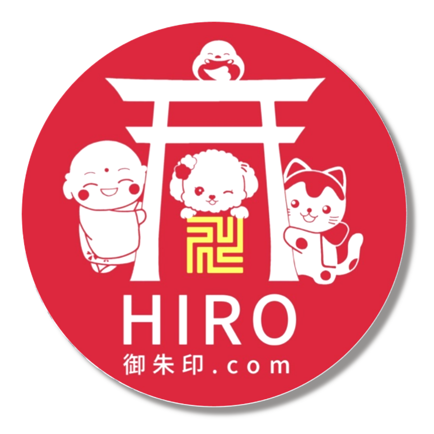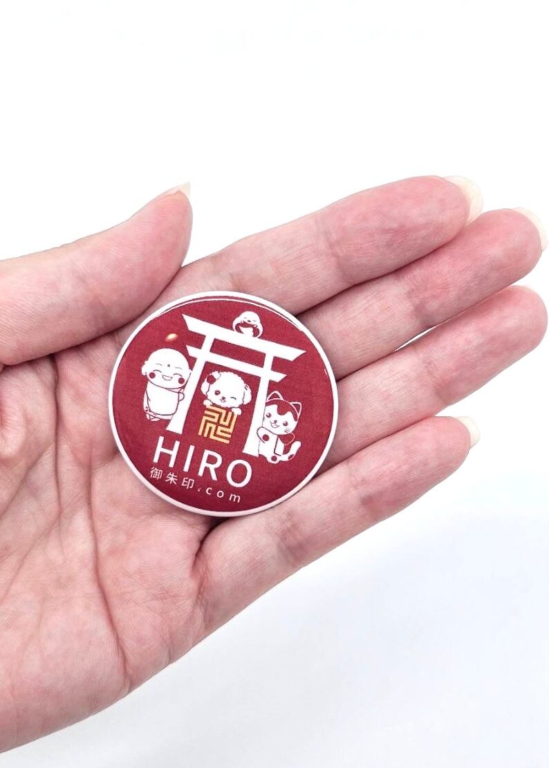 ヒロ御朱印.comの赤いロゴがデザインされた缶バッジです。ステンレス製で、耐久性に優れ、普段使いにもピッタリ!